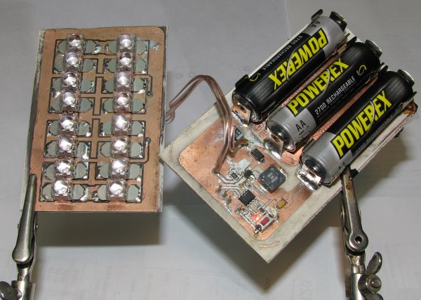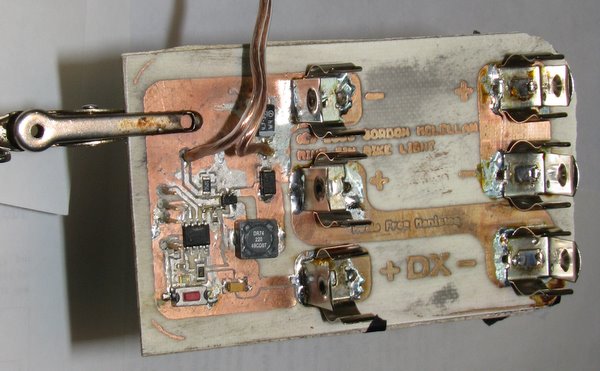 In interest of saving time, I didn’t make a PCB for this revision, but I’ll probably do that for the next prototype. All point to point wiring, I tried to be neat. I used a tiny SMT resistor to drive the transistor, it worked out real handy.