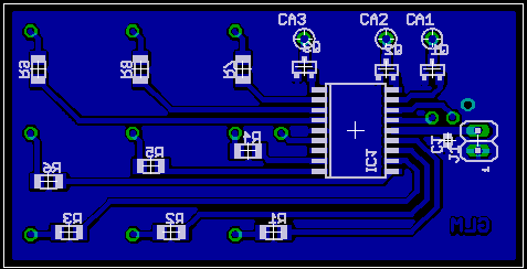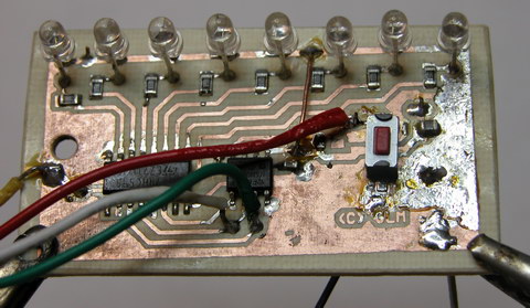 Revision one of my POV toy is compact. It measures approximately 2.25″ length wise by 1.1″ width wise. The circuit consists of an inexpensive Microchip PIC 12F683 microcontroller, and a 74HC595 serial shift register. The display consists of eight 3mm leds, I chose blue for the first unit, but I’ll probably make a few more with different colors, I especially want to see green and amber – those leds don’t see a lot of action in the world of consumer electronics.