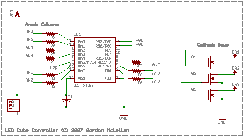 Each anode column is current limited by a 75 ohm resistor. The value chosen was rather arbitrary, since the leds have such a low duty cycle, a lower value would have afforded me more brightness when the cube is battery powered. I can tweak the brightness a bit in the software, changing the scan rate the rows are multiplexed at.