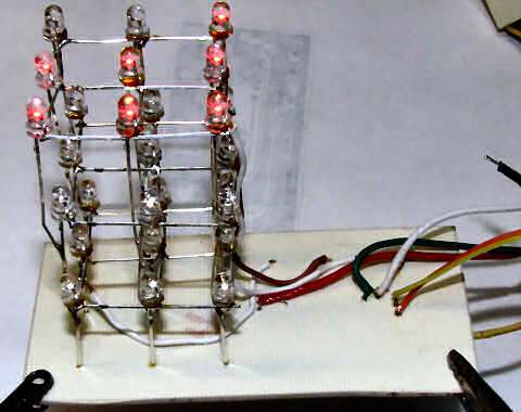 It didn’t take very long to toss three of these nine led matrices together. Assembling them into a twenty-seven led cube was a bit trickier. I used some gator clips to hold parts of the cube while I soldered it. Eventually I finished all the connections and had a passable cube with fairly even spacing.