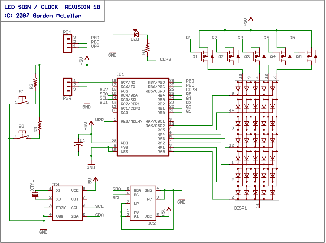 To facilitate the role as an clock, I had to redesign the circuit quite a bit. Two new ICs were added, allowing the LED Sign to keep time, and providing some much needed storage.
