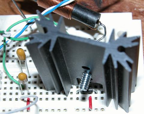 The boost converter is a coil, a few capacitors, a diode and a darlington transistor. The PIC manages switching the transistor. Switching is done autonomously by a PWM generator inside the PIC. Constant current regulation is achieved by measuring the voltage drop across a 100 ohm resistor. The voltage is measured approximately 5000 times a second, and the pwm duty cycle is adjusted up or down, depending on the read voltage’s deviation from the set voltage. With a 100 ohm resistor, the math works out real easy – 100mV is 1 mA. Of course, 100 ohms will not work for a heavy current load – so I will have to reduce it to 1 ohm or 0.5 ohms, which changes my math a little, but no big deal.