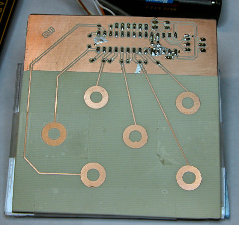 the sensors are simple copper rings, which radiate the electrostatic field this chip uses to sense proximity. a ground plane pour around the IC helps to minimize cross-talk between sensor channels and prevent stray fields from detecting proximity around the chip itself. the capacitors near the chip also sense proximity and will need to be shielded with aluminum foil or something.